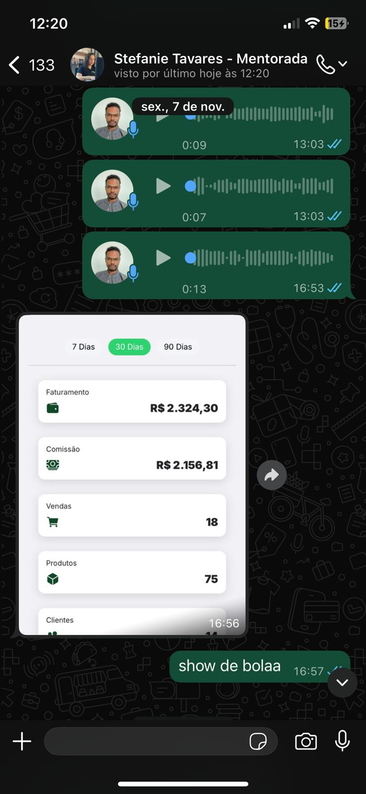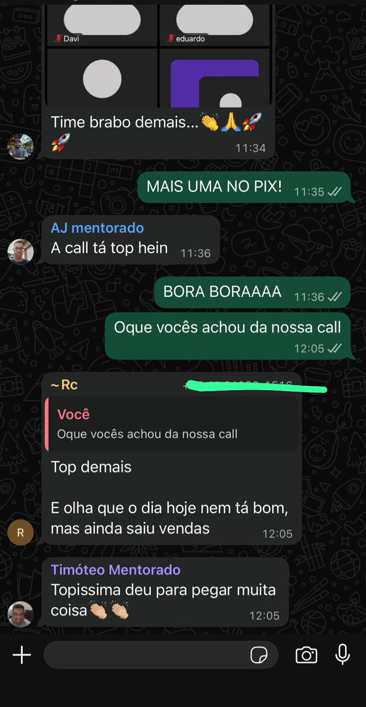 Calls Semanais e suporte comigo Call comigo toda semana e suporte diário via WhatsApp com meu gestor de tráfego, para você nunca ficar travado e sempre saber exatamente o que fazer.